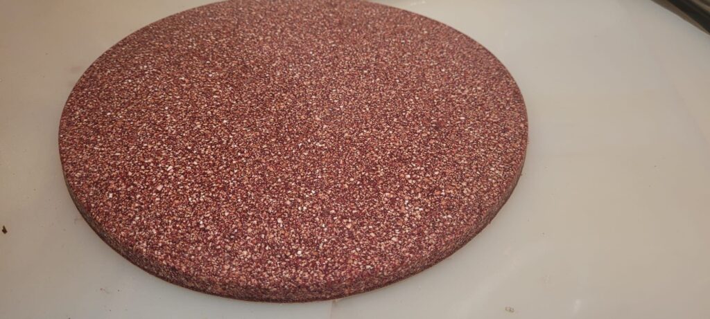 Zelfnivellerende volledig plantaardig thermohardend hars in combinatie met esthetische vulstoffen, geschikt voor afwerking van tafelbladen, keuken- en badkamerbladen, vloertegels, enz.
