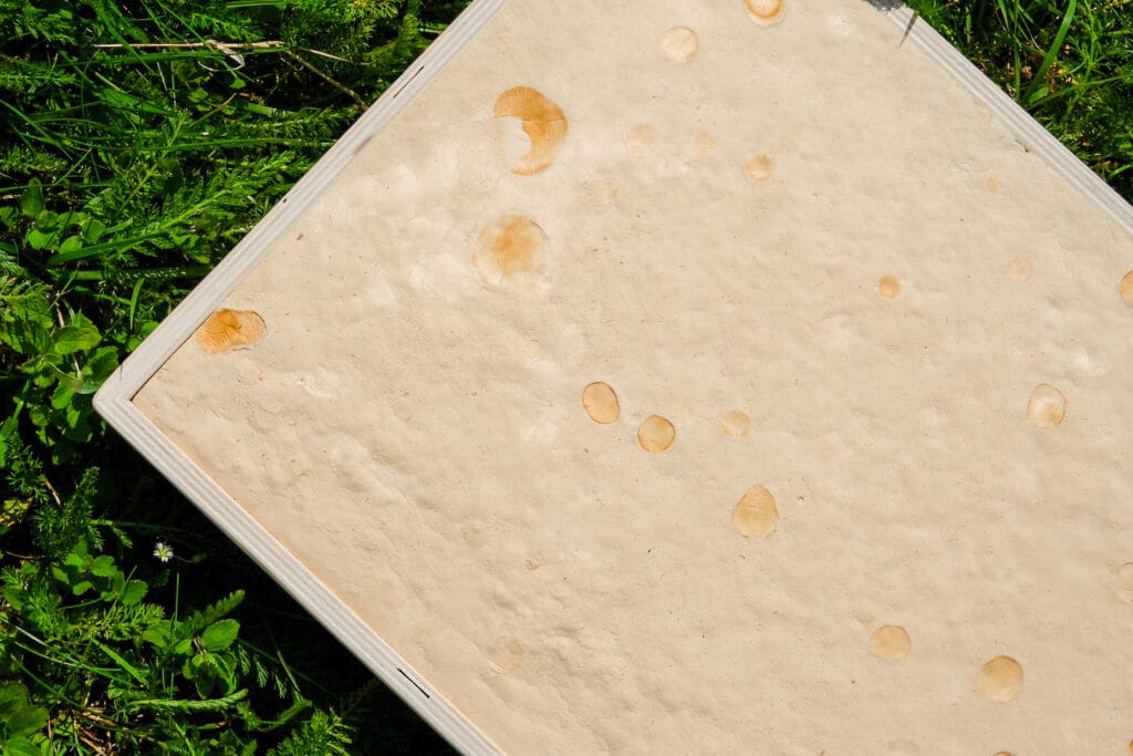 Bij Wageningen University & Research hebben we dit paneel ontwikkeld. Het heeft tarwestro als basisgrondstof en is ge-supplementeerd met een klein percentage meel en vervolgens met water bevochtigd tot het gewenste vochtpercentage. Na de bereiding van het substraat geven we het een hittebehandeling om ongewenste micro-organismen in het substraat te doden, Vervolgens voegen we een bepaalde schimmel toe, brengen we in de productiemal aan waarna het in circa 6-8 dagen volledig kan doorgroeien.